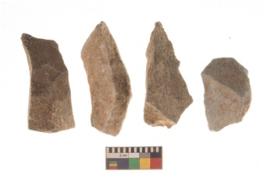 | Description / विवरण | There are n 4 utilized flakes. There are multi directional irregular scar pattern on both dorsal and ventral face of the flakes. three are tapering at one end and one has sharp edge. |