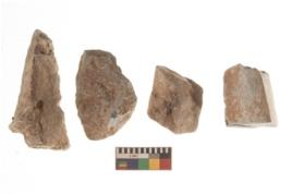 | Description / विवरण | There are n 4 utilized flakes. There are multi directional irregular scar pattern on both dorsal and ventral face of the flakes. Two are tapering at one end and two have blunted edges. |