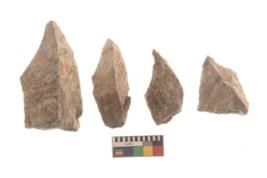 | Description / विवरण | There are n 4 utilized flakes. There are multi directional irregular scar pattern on both dorsal and ventral face of the flakes. three are tapering at one end and one has pointed edge. |