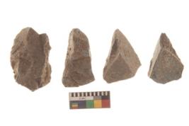 | Description / विवरण | There are n 4 utilized flakes. There are multi directional irregular scar pattern on both dorsal and ventral face of the flakes. Two are tapering at one end and two have blunted edges. |