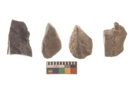 | Description / विवरण | There are n 4 utilized flakes. There are multi directional irregular scar pattern on both dorsal and ventral face of the flakes. Two are tapering at one end and two have blunted edges. |