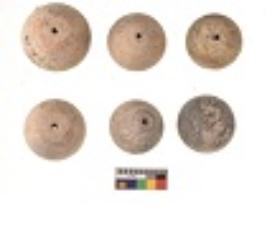 | Description / विवरण | Specimens of six areca nut shaped beads which are centerlly perforated, flat base |