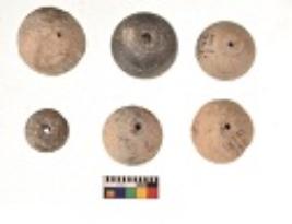 | Description / विवरण | Specimens of six areca nut shaped beads which are centerlly perforated, flat base |