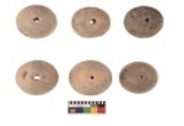 | Description / विवरण | Specimens of six areca nut shaped beads which are centerlly perforated, flat base |