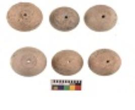 | Description / विवरण | Specimens of six areca nut shaped beads which are centerlly perforated, flat base |