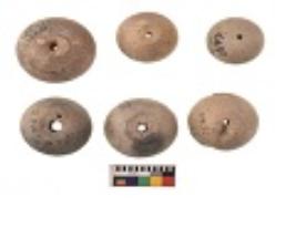| Description / विवरण | Specimens of six areca nut shaped beads which are centerlly perforated, flat base |