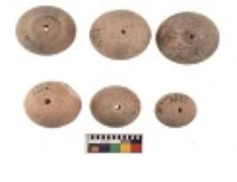 | Description / विवरण | Specimens of six areca nut shaped beads which are centerlly perforated, flat base |