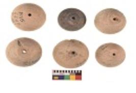 | Description / विवरण | Specimens of six areca nut shaped beads which are centerlly perforated, flat base |