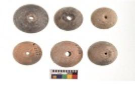| Description / विवरण | Specimens of six areca nut shaped beads which are centerlly perforated, flat base |