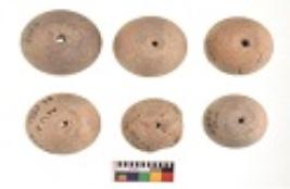 | Description / विवरण | Specimens of six areca nut shaped beads which are centerlly perforated, flat base |