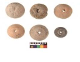 | Description / विवरण | Specimens of six areca nut shaped beads which are centerlly perforated, flat base |
