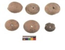 | Description / विवरण | Specimens of six areca nut shaped beads which are centerlly perforated, flat base |