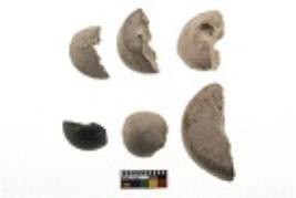 | Description / विवरण | 6 beads, 3 are areca nut shaped, one ghat shape, 2 are shperical in shape, flat base, perforation at center |