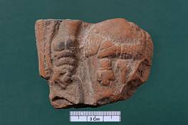 | Description / विवरण | Fragment of a plaque preserving the lower portion of the right hand and right part below navel and above thigh of a figure. |