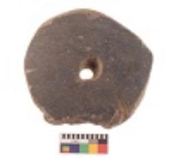 | Description / विवरण | Specimen of a circular perforated disc of Grey ware; it is damaged at its circumference. |