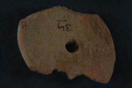 | Description / विवरण | It s a wheel made of terracotta. It is not well fired and colour is ochred. Border is broken and a hole on it. Rubbing on the surface. |