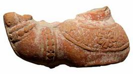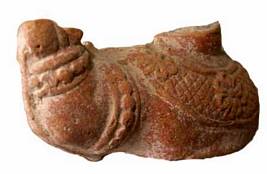 | Description / विवरण | A partly broken right hand of human terracotta wearing beaded keyura, wrist bands and also a heavily jeweled hara with flower design. |