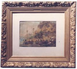 | Description / विवरण | Water colour painting on paper depicting dockyard. Fitted in an ornamental wooden frame with glass pane. |