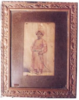 | Description / विवरण | Water colour painting on paper, portraying Nawab Nazim Feradun Jah in standing posture. Fitted in a wooden frame with glass pane. |