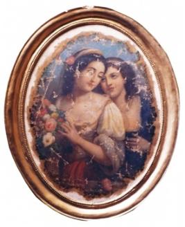 | Description / विवरण | Oil Painting on canvas the oval shaped panel portraying two ladies. One lady holding a bunch of flowers and another lady resting to the flower lady. Fitted in an oval shaped wooden frame. |