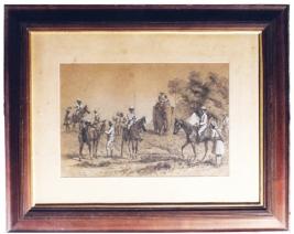 | Description / विवरण | Sketch showing the hunters, few are on horseback and one on elephant and few are standing on the ground. Most probably they were searching the animals. And below a signature on the left side Albert Dubug . Fitted in a wooden and glass frame. |