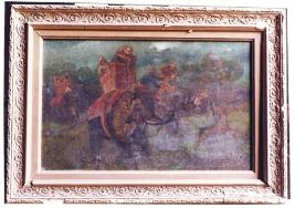 | Description / विवरण | Oil painting on canvas portraying a hunting scene. Fitted within a decorated wooden frame in golden colour. |