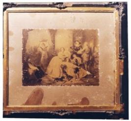 | Description / विवरण | Sketch portraying the royal family most probably a Queen is sitting on the royal chair and surrounded by nobles and one lady and children s and also seen few nobles behind the Queen few nobles are discussing. Most probably the background painting and on the other side some nobles were sitting and discussing something and one service lady carrying may be tea raising her hand and another person with musical instrument. On his right sitting beside the stair case also seen one book, one dog and cat and a tray line on the floor. Fitted in a wooden frame. |