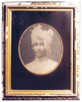 | Description / विवरण | Photograph portrait of Nawab Kazem Ali Meerza. Most probably in standing posture fixed on oval shaped, and covered by black velvet fitted on decorated wooden frame in golden colour with glass pane. |