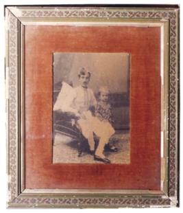 | Description / विवरण | Photograph portrait of Nawab in sitting posture on his left side most probably his own child is in standing posture. Inside covered by velvet. Fitted in an ornamental wooden frame in brown colour inside flower motifs designs outside with olive green colour coved with glass pane. |