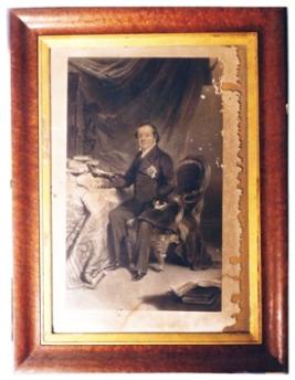| Description / विवरण | Sketch Painting on paper portraying of an European General sitting in his study room and also seen two books lay on the floor. The caption of the painting is Metcalfe . Fitted in a wooden frame with glass covered. |