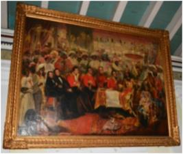 | Description / विवरण | Large Oil Painting on canvas portraying Nawab Nazim Humayun Jah in Darbar hall with courtier and Colonel MacLeod Duncan. The architect presenting the plan of the Palace to Nawab. Fitted in an ornamental wooden frame. |
