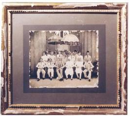 | Description / विवरण | Group photograph showing Nawab Bahadur Wasif Ali Meerza seated under royal umbrella in the front row along with British agents and other personals. Fitted in a wooden frame covered glass. |