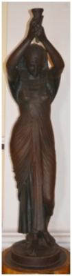 | Description / विवरण | Hollow metallic statue of an Egyptian standing female figure, holding a light stand over her head, wearing creased garment and compact head gear, having belt o both sides over it. A snake like design is seen on her forehead. A hieroglyphic inscription is found on the lower crease of her dress. She is standing on a circular pedestal in welcome posture. The statue ahs been manufactured through the lost wax process of Cire Perdue Technique. |