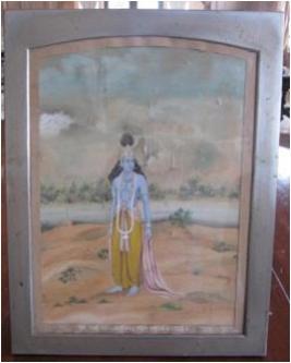 | Description / विवरण | Painting of lord Shri Krishna, within steel plated wooden frame. Right hand of Lord shri Krishna holding a flute while left hand is cloth. |