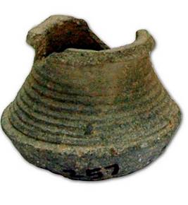 | Description / विवरण | Black ware miniature pot with carinated waist and flat base. Tapering sides, concave neck with splayed out flat rim. |