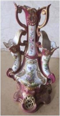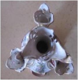| Description / विवरण | White & pink colour flower pot, having golden colour out line & a painting of flower bunch on it belly. Having three mouths. |