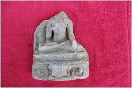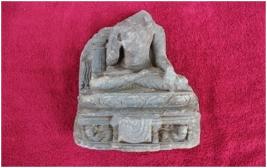| Description / विवरण | Headless Buddha seated in Vajrasana attitude on a double petalled lotus and reaching against a high backed throne on the stele, right hand broken and the left displayed in Varada pose touching the left leg near the knee, drapery in many folds thrown over left shoulder two lions shown on the pedestal, inscription in two lions on the back of the stele. |