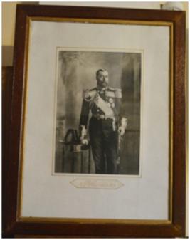 | Description / विवरण | Photograph portraying of an European person in standing posture in royal dress, holding the hilt of the sword on his left hand while the right hand resting on the table. It is entitle His Majesty King George V. copyright 1910 by Raphael Luck & Sons Ltd. Publishers their Majesty the King & Queen. Printed in England. Fixed n a wooden frame covered with glass pane. |