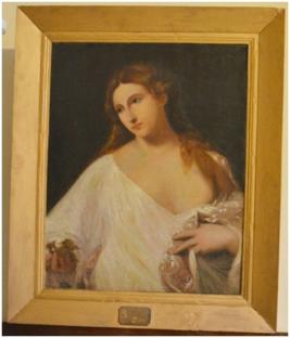 | Description / विवरण | Oil Painting on canvas portraying the bust of a lady with the title Flora after Titian . Fitted in an ornamental wooden frame. |