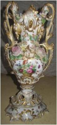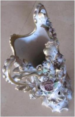 | Description / विवरण | Porcelain flower pot having golden colour painting work on height background. A beautiful basket of flowers has been painted on its belly. |