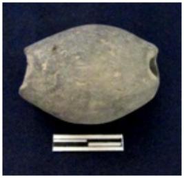 | Description / विवरण | Bead of drum shape. Some portion is partly damaged. Semi-well fired bead is black in color. |