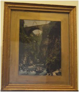 | Description / विवरण | Photograph depicting a brick bridge connecting both the side and just below there is a river stream which is running flowing. Fitted in a wooden and glass frame. |