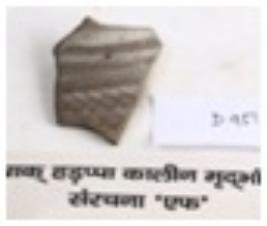 | Description / विवरण | Small size Fabric F Grey coloure pot fragment made of fine clay and on wheel and well fired having beautiful white coloure choker design wth black band on the body surface. |