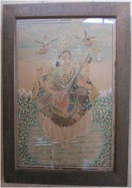 | Description / विवरण | Painting shows goddess Saraswati, playing a veena, seated on a lotus, attendee by two flying female devotee |