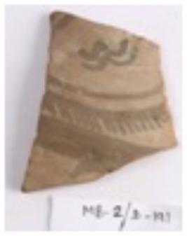 | Description / विवरण | Fabric A Red colored pot Shard made of fine levitated clay and turned on fast wheel and well fired with black colored slipped bands like leaf type design. |