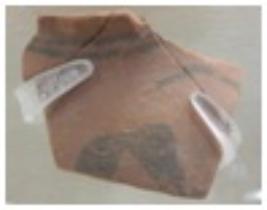 | Description / विवरण | Fabric A Red colored pot Shard made of fine levitated clay and turned on fast wheel and well fired with black colored slipped with band and others design. |