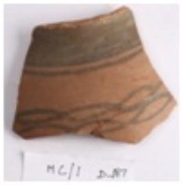 | Description / विवरण | Fabric A Red colored pot Shard made of fine levitated clay and turned on fast wheel and well fired with black colored slipped with band and chain type design. |