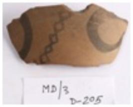| Description / विवरण | Fabric A Red colored pot Shard made of fine levitated clay and turned on fast wheel and well fired with black colored black colored chain and circle design. |