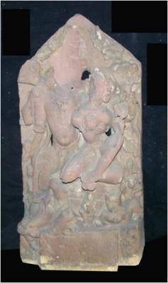 | Description / विवरण | An image of Uma-Mahesvara in alingana mudra, seated on Kailasa, Siva showing four armed. The right hands are missing, the corresponding left hands showing, holding a serpent and one hand placed near the breast of Parvati. The right hand of Devi shown placed on the shoulder of Siva and the left hand is not distinct. The head and right leg of Siva are missing where as the right leg of Parvati also missing. On the top of the image, two flying figures are shown. On either side of the padapeeth Kumar and Ganesh are shown respectively right and left. Below the seat the Nandi Bull and lion have been depicted, the head of Nandi bull is turned towards the divine couple in rapt attention. In between the two animals one male figure is depicted. |