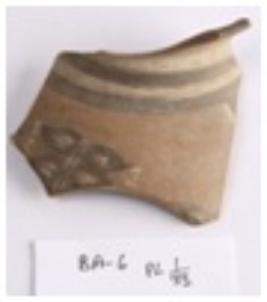 | Description / विवरण | Fabric A Red colored pot Shard made of fine levitated clay and turned on fast wheel and well fired with black and white colored bands with leaf design. |
